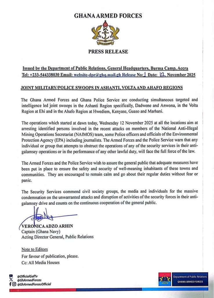 A statement issued by the Department of Public Relations of the Ghana Armed Forces explained that the operation began at dawn on Wednesday, November 12, 2025, and was aimed at arresting individuals linked to recent violent attacks on members of the National Anti-Illegal Mining Operations Secretariat (NAIMOS), Police officers, Environmental Protection Agency (EPA) officials, and journalists.