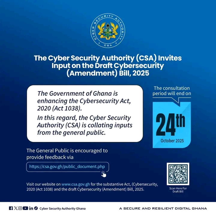 Ghana’s Cyber Security Authority (CSA) has moved to tighten the country’s cyber laws through a sweeping amendment to the Cybersecurity Act, 2020 (Act 1038). The proposed Cybersecurity (Amendment) Bill, 2025 was developed and refined via a CSA-led public consultation that concluded on October 24, 2025.The consultation invited input from all quarters cybersecurity professionals, service providers, civil society groups and the general public to ensure the law reflects stakeholders’ views. In announcing the review, the government emphasized that the updated law “confers powers on the Cyber Security Authority to investigate and prosecute cybercrime on the authority of the Attorney-General and recover proceeds of cybercrime; revise the object and functions of the Cyber Security Authority; revise the governance and administration of the Cyber Security Authority; revise the enforcement powers of the Cyber Security Authority and provide for related matters”. In other words, the amendments are designed to expand the CSA’s mandate, strengthen enforcement, and address emerging threats.