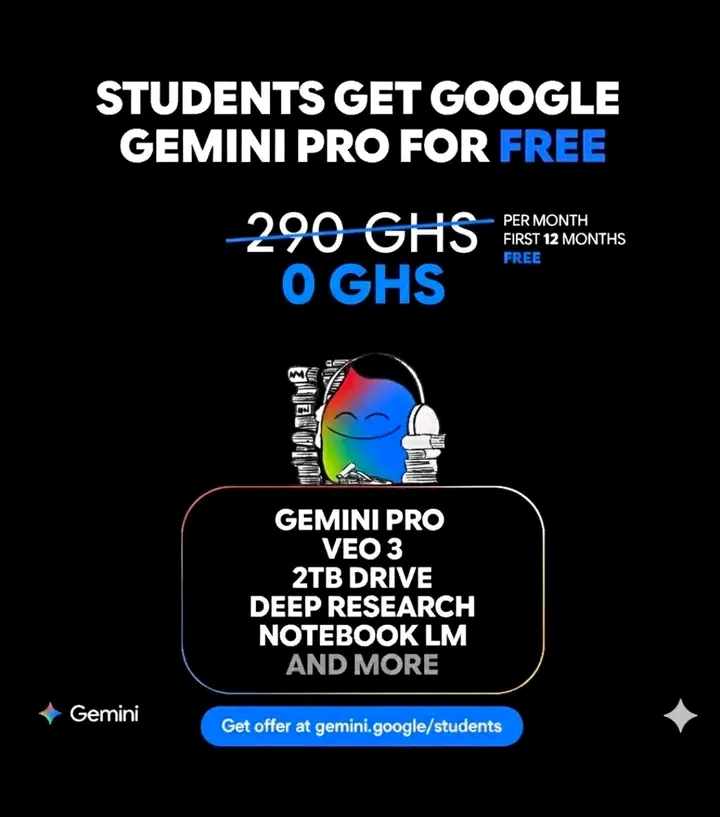 As part of our efforts to put cutting-edge technology in the hands of our next generation of leaders and problem solvers, I am pleased to announce that, until December 9, 2025, you can sign up to use #GeminiApp for free for 12 months with 2TB storage as a Ghanaian student. You also get free AI Certification training.