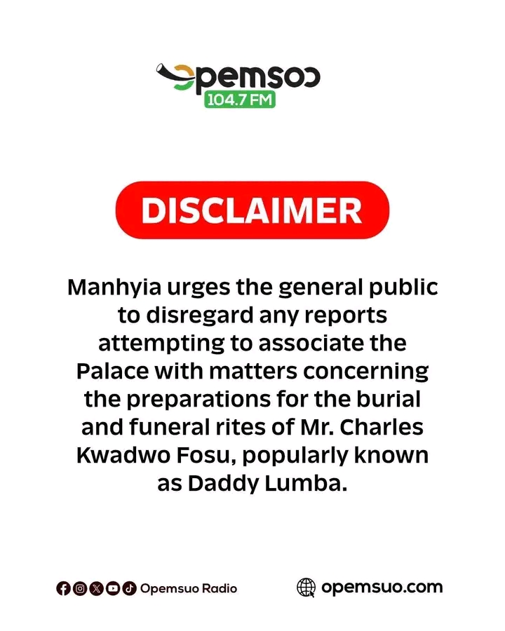 In a public disclaimer issued through Opemsuo Radio on Thursday, December 11, 2025, the Palace urged the public to “disregard any reports attempting to associate the Palace with matters concerning the preparations for the burial and funeral rites of Mr. Charles Kwadwo Fosu, popularly known as Daddy Lumba.”