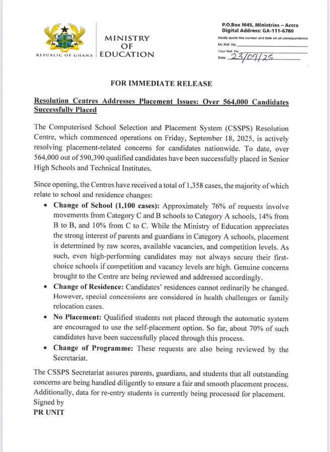The Ministry of Education has announced that over 564,000 candidates have successfully secured placement into Senior High Schools and Technical Institutes across the country through the Computerised School Selection and Placement System (CSSPS).