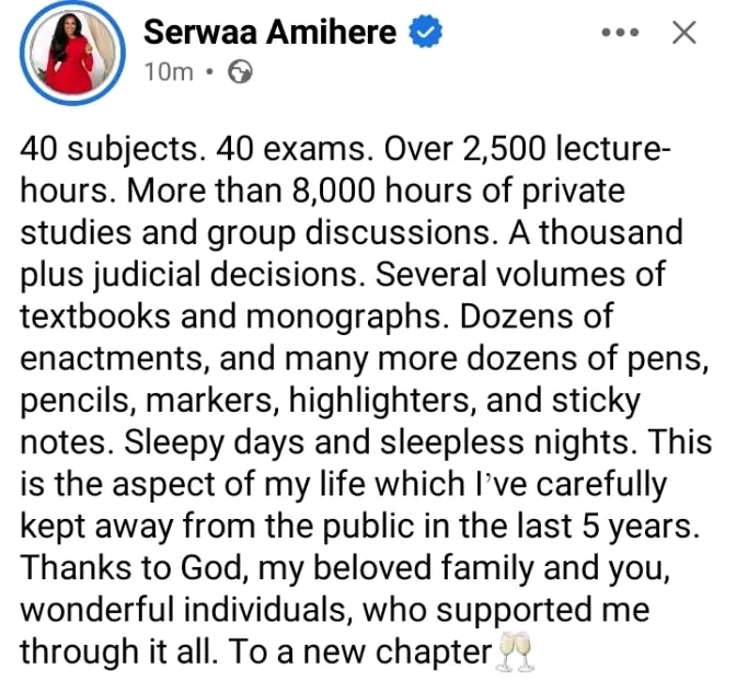 The GHOne TV presenter revealed that she had intentionally kept her legal studies private, focusing quietly on her goal while balancing her media career. Her post has since attracted thousands of congratulatory messages from fans, colleagues, and public figures who praised her determination and discipline.